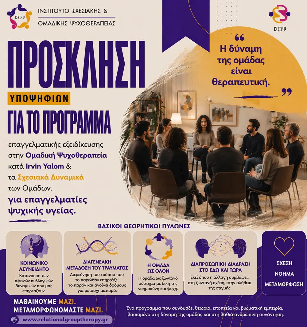 Κύκλος Επαγγελματικής Επιμόρφωσης στην Ομαδική Ψυχοθεραπεία κατά Irvin Yalom και στα Σχεσιακά Δυναμικά των Ομάδων